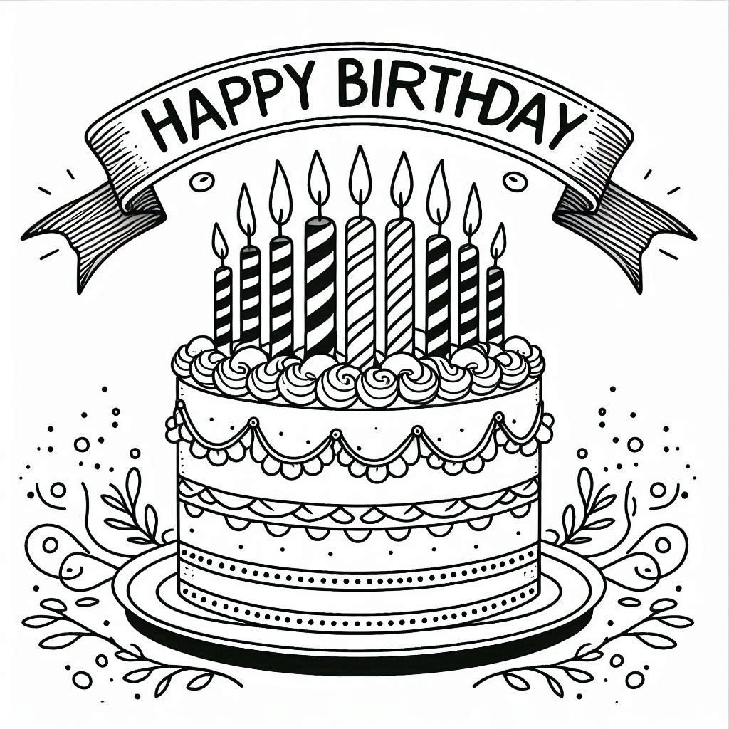 Birthday coloring page with candles and confetti